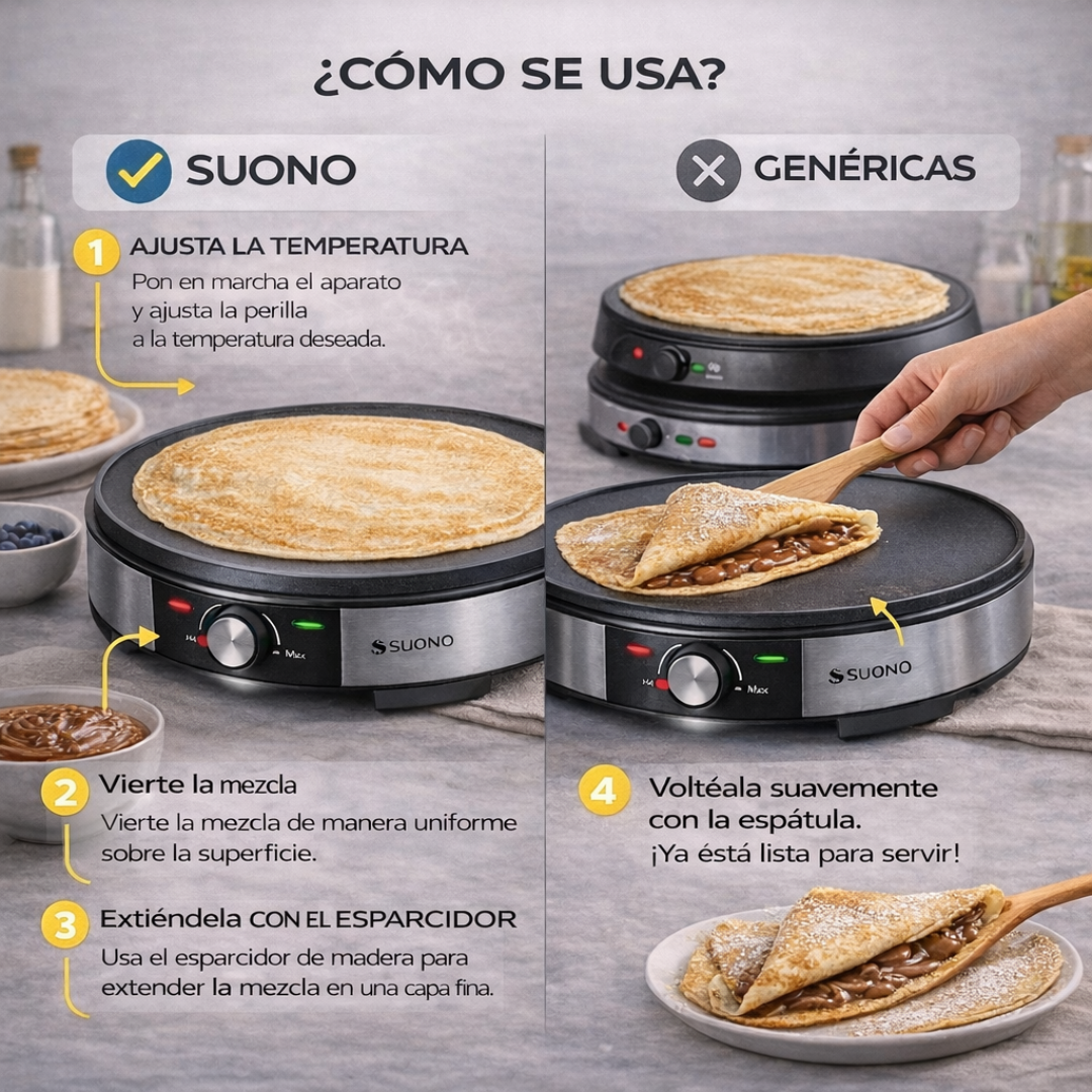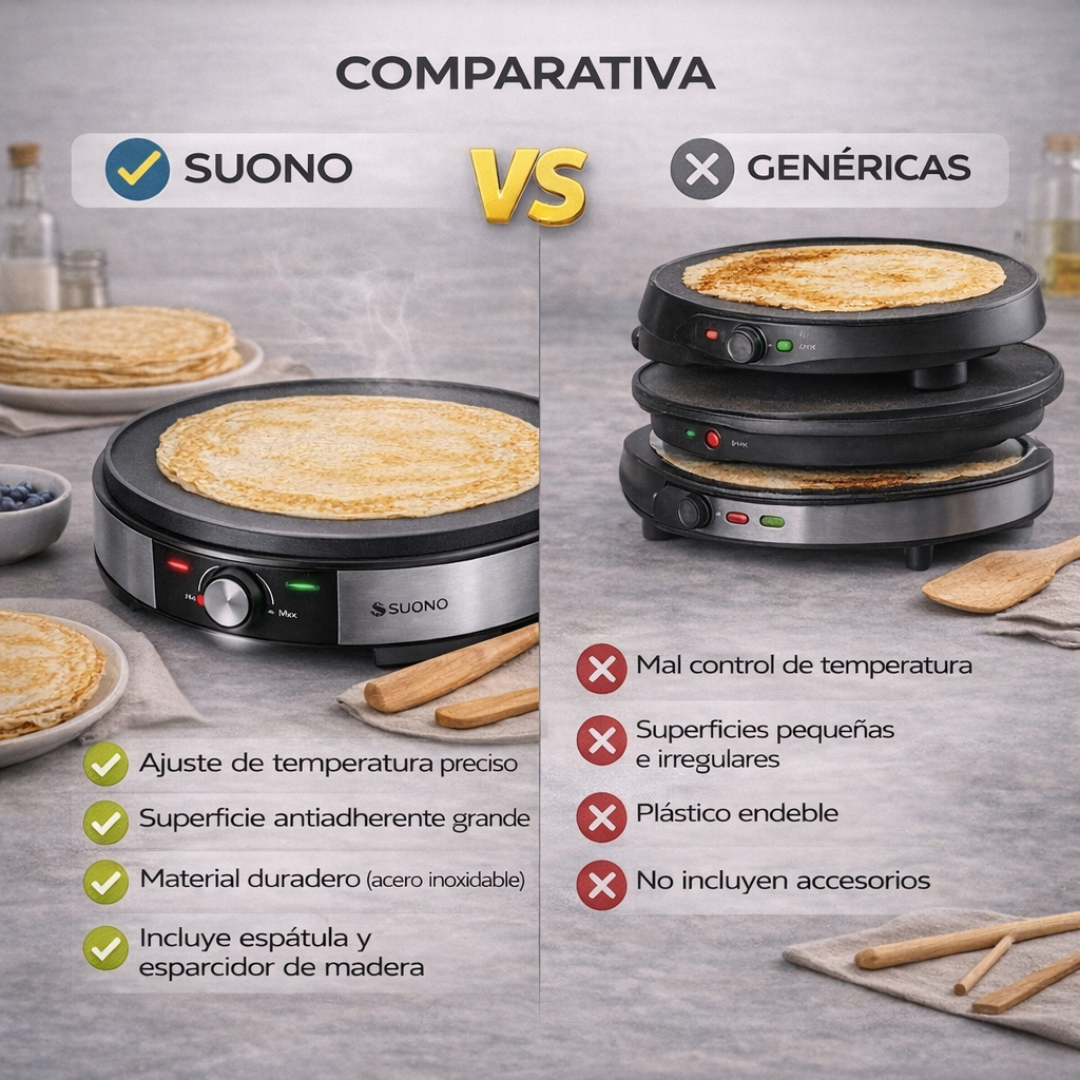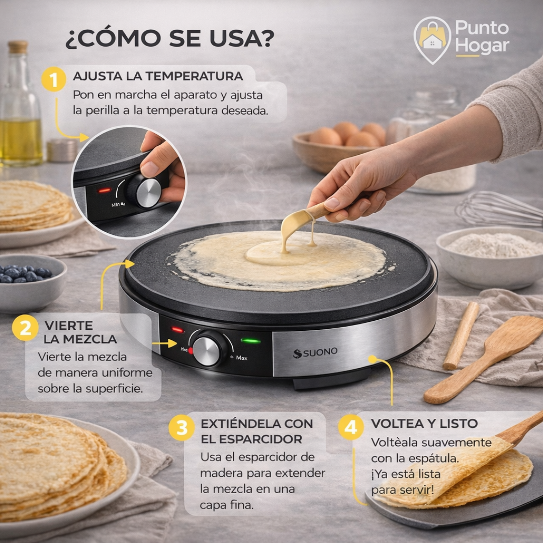 Prepará crepes y panqueques perfectos en minutos con temperatura regulable, superficie antiadherente y accesorios incluidos.